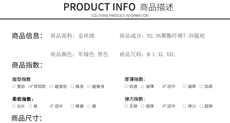 商品货号:PPKY1603A 商品品牌:皮皮酷依 商品重量:410克 产地:杭州 商品面料:金丝绒 商品里料:92.5%聚酯纤维7.5%氨纶